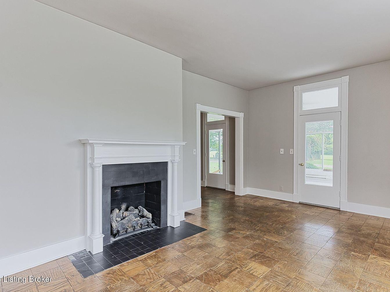 A spacious living room features a traditional fireplace as the focal point, adorned with a stylish white mantel that elegantly frames the dark tile hearth. The walls are painted in a soft gray, enhancing the room’s airy feel. Natural light streams in through large windows, illuminating the polished wooden floor with a parquet pattern. Architectural details include classic moldings and trims, contributing to the historic charm of the space. A door flanked by sidelights leads to the outdoors, promoting a seamless connection with nature. Overall, the room balances classic aesthetics with modern functionality.