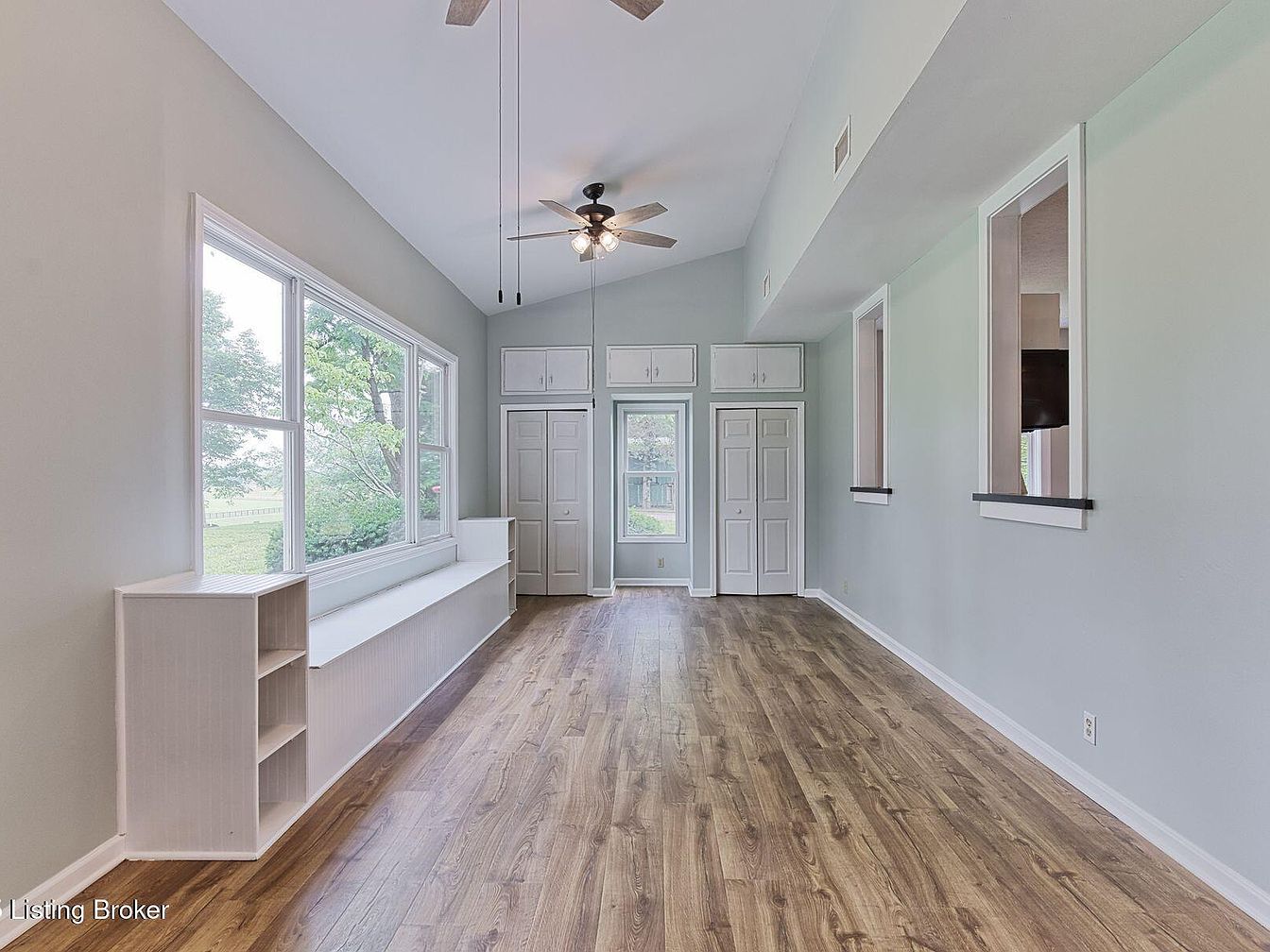 This sunroom features a high ceiling that enhances the spacious feel, with soft green walls and a light wood-tone floor. Large windows line one side, offering abundant natural light and picturesque views of the outside greenery. A built-in seating area stretches beneath the windows, complemented by white cabinetry that provides both function and aesthetics. Opposite, a set of double doors accesses additional rooms, framed by more cabinets above for extra storage. Minimalistic design elements ensure the space feels airy, while ceiling fans add a touch of comfort and style, making this an inviting retreat within the home.