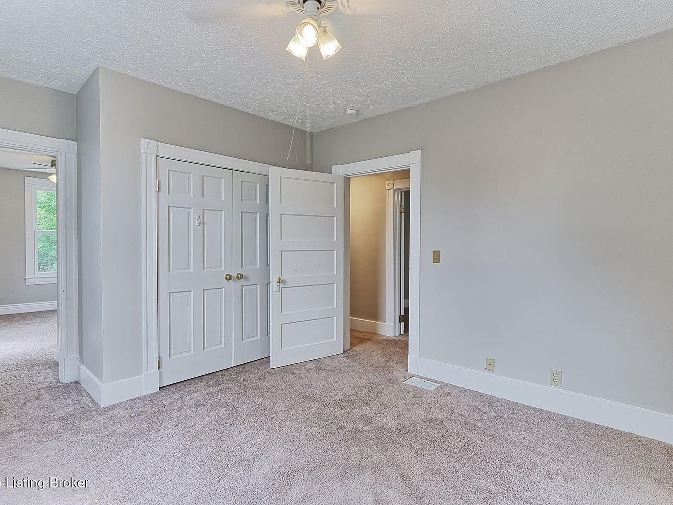 This bedroom features a soothing gray color scheme that enhances its airy feel. Plush beige carpeting stretches across the floor, providing warmth and comfort underfoot. A ceiling fan with light fixtures ensures good air circulation. The room showcases a set of double doors leading to a closet, emphasizing the generous storage space available. Adjacent to the closet, another door opens into a small hallway, suggesting convenient access to additional rooms. Natural light streams in through large windows dressed with simple trim, highlighting the clean architectural lines and creating an inviting atmosphere perfect for relaxation.