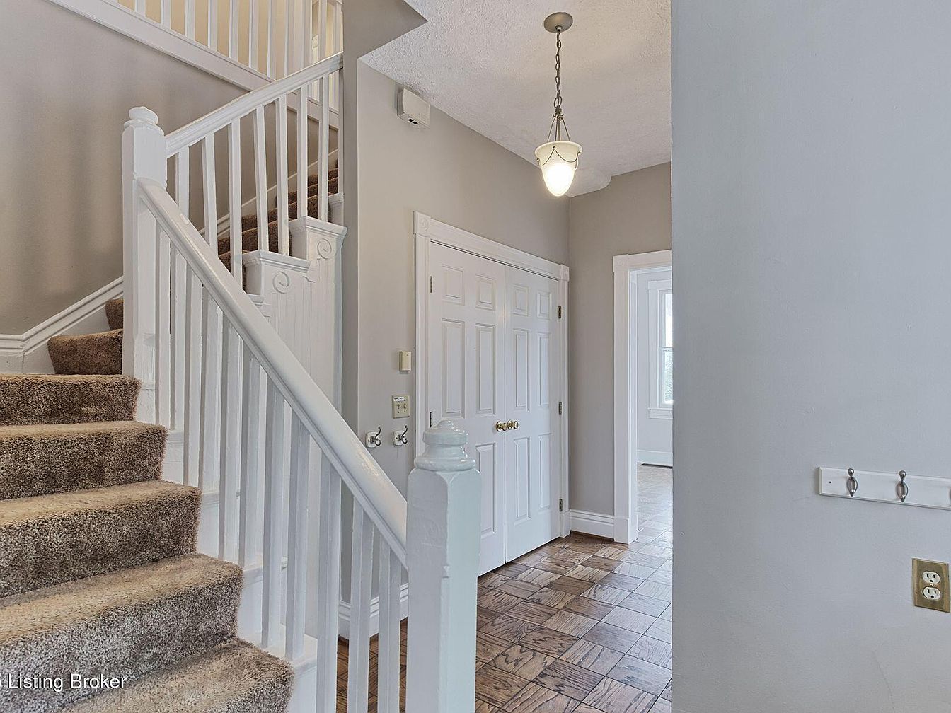 This entryway features a welcoming ambiance with a muted color palette of soft grays, complemented by bright white trim and fixtures. A curved staircase with plush, beige carpeting leads to the upper level, flanked by white balusters that add architectural interest. The floor showcases rich, honey-toned wooden tiles arranged in a classic pattern, enhancing the warmth of the space. A simple, elegant light fixture hangs overhead, illuminating the area efficiently. Double doors with brass hardware open to reveal additional rooms, while a wall-mounted coat rack provides functionality, making this transition space both practical and inviting.