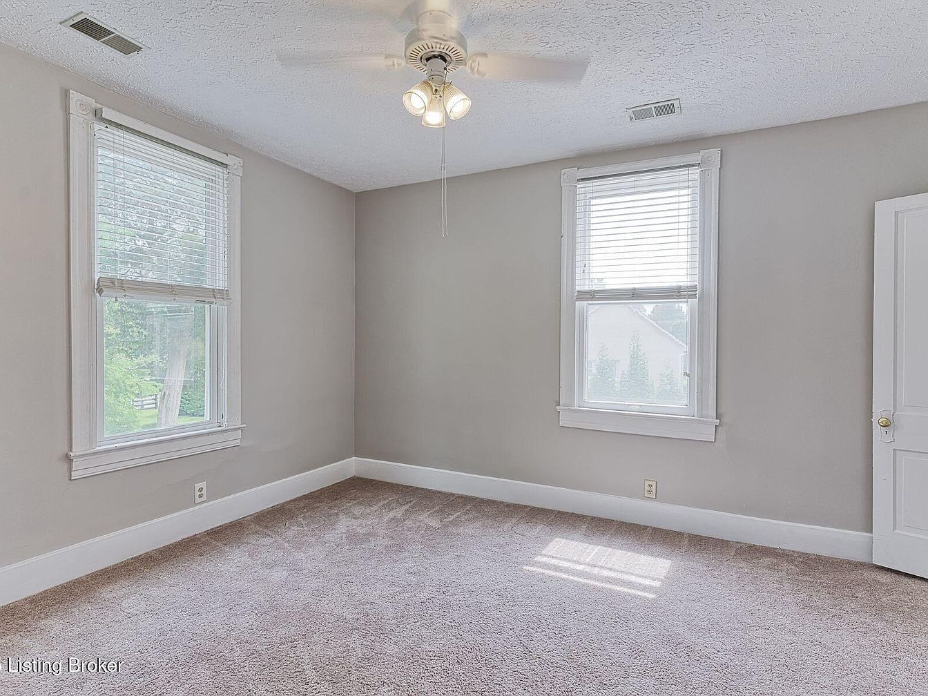 This cozy bedroom features soft beige wall colors, complementing the plush, light carpet that covers the floor. Two large windows with white blinds allow natural light to fill the space, creating a bright and airy atmosphere. The classic white trim accentuates the windows and door, adding a touch of elegance. A ceiling fan with light fixtures hangs centrally, enhancing the comfort while providing ventilation. The room layout is simple yet functional, offering ample space for furniture arrangement. Overall, the aesthetic exudes tranquility, perfect for a restful night’s sleep or quiet reading.