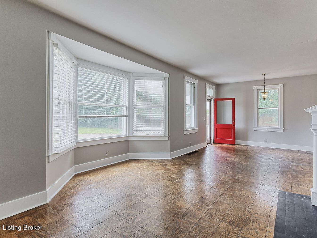 A spacious living room featuring warm wood flooring that complements the light gray walls. A large bay window allows ample natural light and showcases decorative white blinds. The window’s shape adds architectural interest, enhancing the room’s charm. Across the room, a vibrant red door serves as a striking focal point, contrasting beautifully with the neutral tones. Simple white trim outlines the windows and door, offering a clean finish. A hanging light fixture provides soft illumination, hanging elegantly in the center of the room. The overall layout promotes a sense of openness, inviting creativity in furniture arrangement.