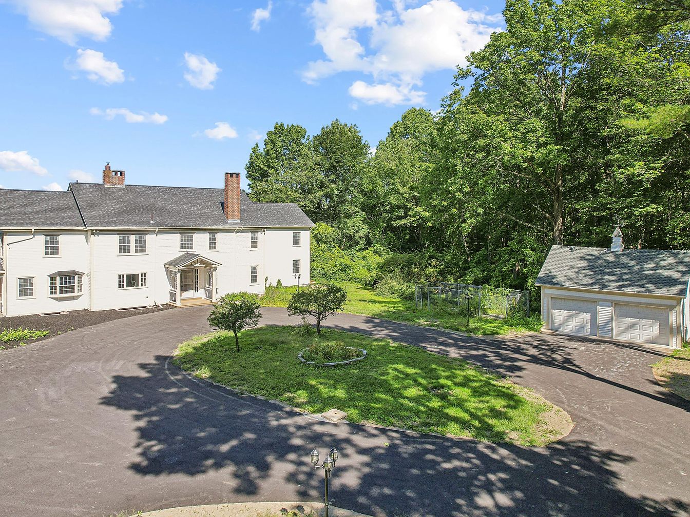 The image showcases the front exterior of a historic American home surrounded by lush greenery. The house features a classic white facade with black shutters, highlighted by a symmetrical design and a gabled roof. A well-maintained asphalt driveway curves around, leading to a central entryway with a small porch supported by columns. Towering trees frame the property, casting dappled shadows on the grass. The manicured lawn adds to the serene atmosphere, while the backdrop of trees provides depth and privacy. A bright blue sky with scattered clouds enhances the inviting and tranquil setting.