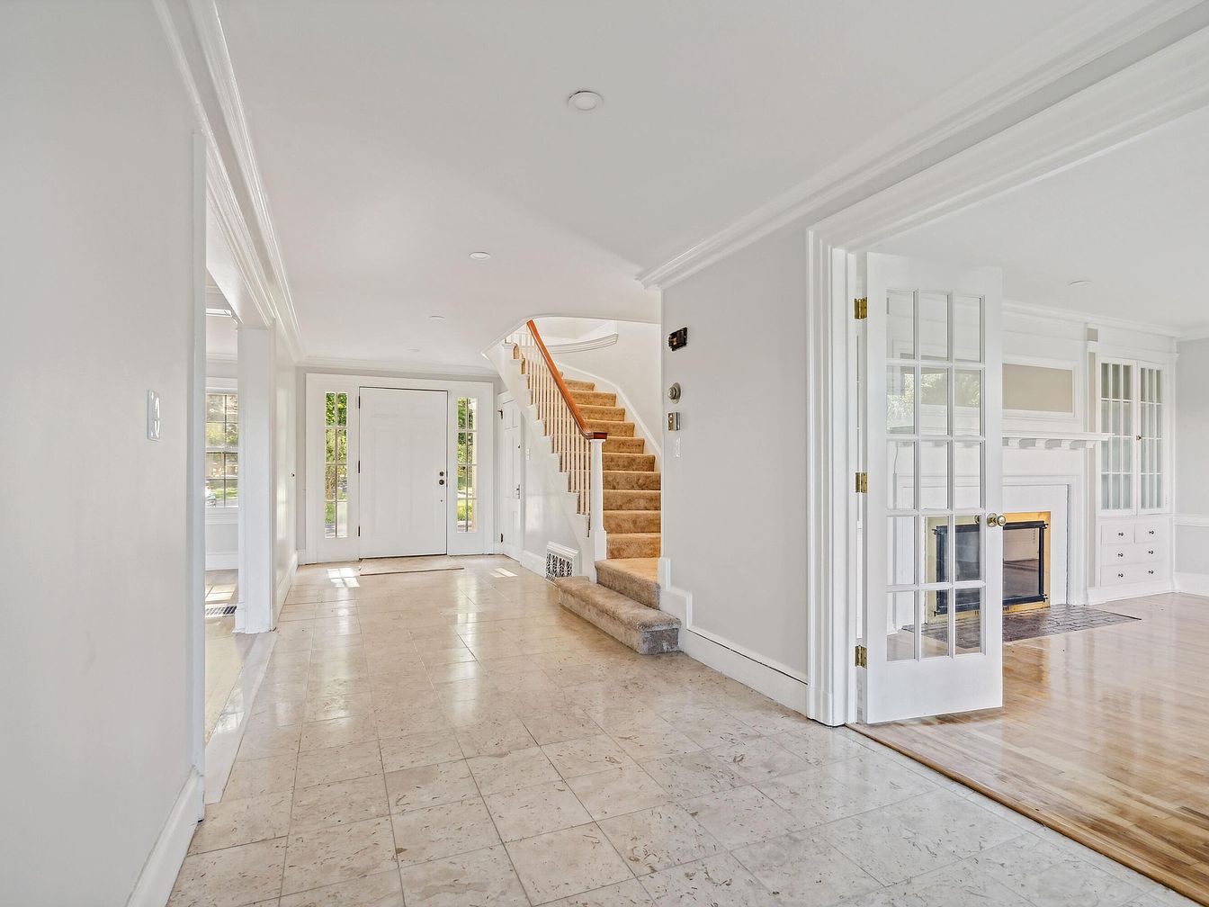 A spacious entry hall features polished marble flooring that reflects natural light from surrounding windows. To the left, a set of double doors leads outside, while straight ahead opens to a carpeted staircase flowing upward. The walls, painted in a soft white, create a serene ambiance, accented by elegant crown molding. Adjacent to the staircase, a partially open doorway reveals a cozy living area with built-in shelves and a fireplace, suggesting a seamless transition to a welcoming family space. The overall design emphasizes brightness and openness, enhancing the historic charm of this classic American home.