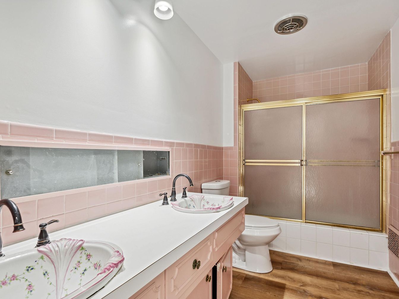 This bathroom features a vintage style with charming pink tones dominating the tile work. A double sink vanity showcases elegant, shell-shaped basins adorned with delicate floral patterns, complemented by sleek, dark faucet fixtures. Walls are lined with glossy pink tiles, enhancing the light atmosphere. An inset glass brick window allows natural light while ensuring privacy. The bathroom also includes a glass shower enclosure framed in gold, adding a touch of luxury. The juxtaposition of airy white accents with pastel hues creates a nostalgic feel, while the wood-look flooring introduces warmth, balancing the room’s aesthetics.
