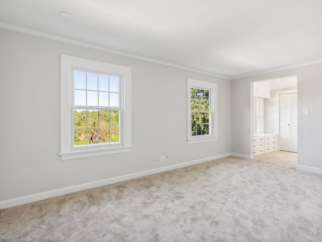 This bedroom features a light and airy ambiance with its soft gray walls and plush beige carpeting. Natural light floods the space through two large double-hung windows, framed elegantly with white trim that contrasts beautifully against the wall color. The room has a clean layout, emphasizing simplicity and functionality. A doorway on the right leads to a cozy nook, complete with a built-in vanity or storage area, adorned with multiple drawers and bright white cabinetry. Architectural details such as crown molding enhance the ceiling, adding a touch of sophistication to this serene retreat.
