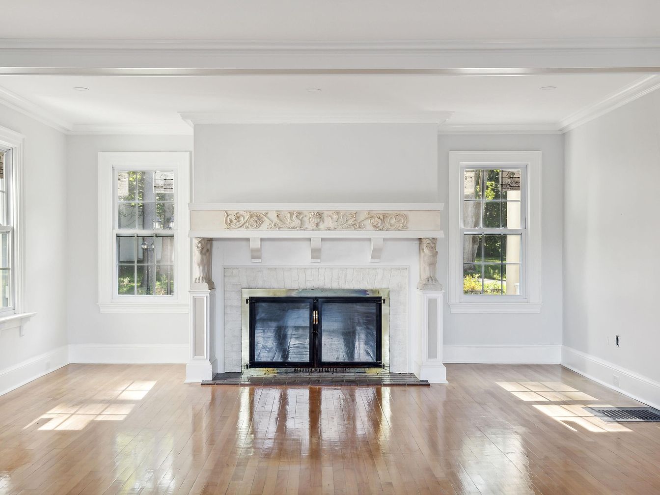 A spacious living room featuring a grand fireplace as the centerpiece. The fireplace has an ornate mantle adorned with intricate carvings, complemented by classical lion head sculptures on either side. Light streams in through two large windows, enhancing the bright, airy atmosphere. The walls are painted in a soft, white hue, accentuating the natural wood flooring which gleams under the sunlight. The overall aesthetic is a blend of elegance and simplicity, harmonizing traditional architecture with contemporary sensibilities, making the space inviting and timeless.