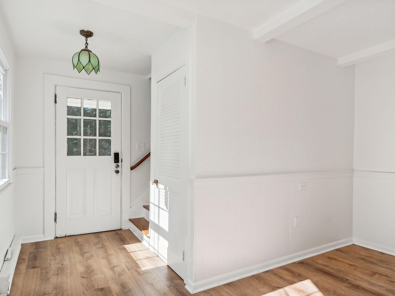 The entryway features a bright and inviting space marked by white walls and a polished wooden floor. Light streams in through a large window, illuminating a classic four-paneled door, which showcases a decorative glass inlay. A unique green-stained glass pendant light hangs from the ceiling, adding an elegant touch. To the right, a shallow closet blends seamlessly into the wall, while a staircase leads upward, accented by rich wooden steps. The baseboards and the wainscoting enhance the room’s character, creating a clean, airy atmosphere that welcomes guests into the home.