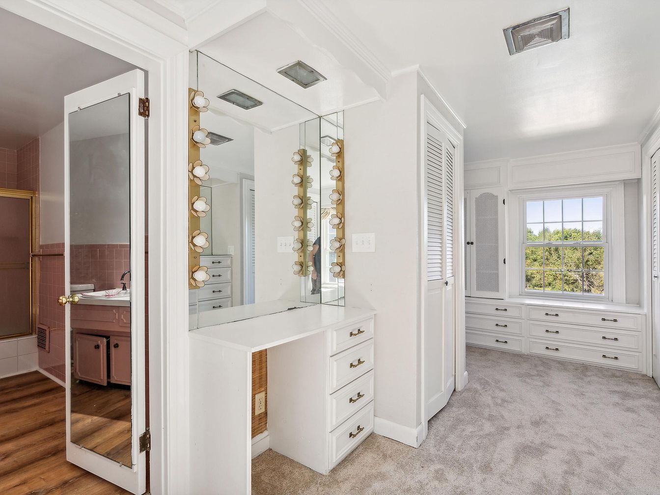 A well-designed dressing area features a bright, airy feel highlighted by soft white walls and plush carpeting. A sleek makeup vanity with a shimmering mirror is adorned with decorative light fixtures, enhancing its elegance. Adjacent, a doorway leads into a vintage pink-tiled bathroom that echoes classic design elements. Ample built-in storage with white cabinetry offers convenience, while large windows fill the space with natural light, providing a view of lush greenery outside. The overall aesthetic combines traditional charm with modern functionality, creating a serene space for self-care and preparation.