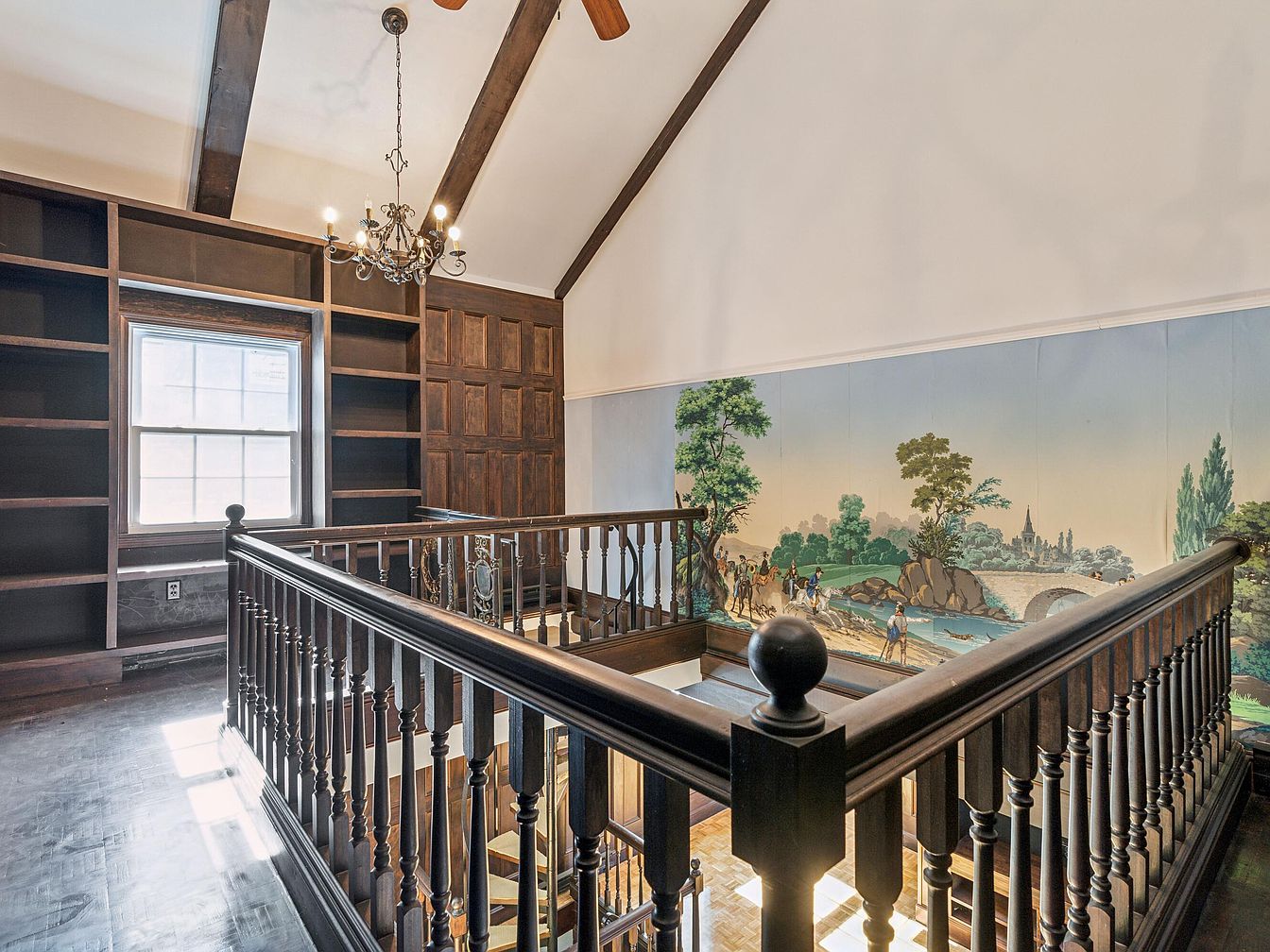 This space features a lovely staircase landing, showcasing a high, vaulted ceiling with exposed wooden beams that add rustic charm. Dark wood railings contrast beautifully with the lighter wall color. A central chandelier with multiple bulbs enhances the ambiance, casting a warm glow. The wall behind the railing is adorned with intricate scenic wallpaper, depicting a peaceful riverscape, creating a serene focal point. Built-in wooden shelves line one side of the room, offering storage and display options. Natural light streams through the adjacent window, illuminating the polished wooden floor, enhancing the inviting atmosphere.