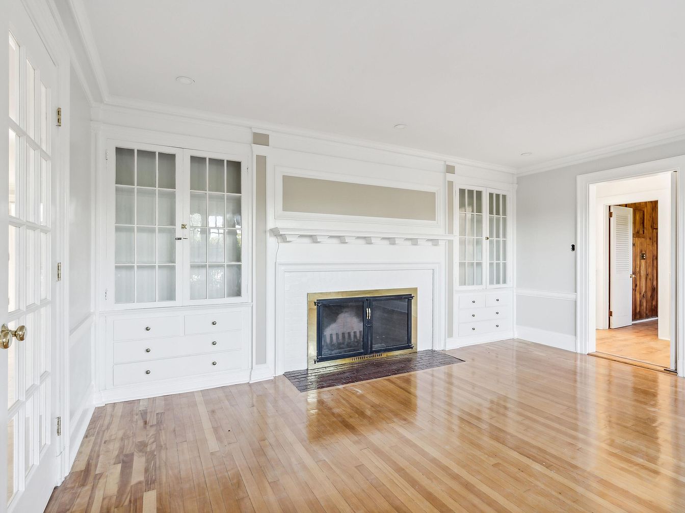 A spacious living room features elegant architectural details, with refined white molding and soft gray walls contributing to its classic aesthetic. The central fireplace, with a sleek black trim and decorative mantle, serves as a focal point. Flanking the fireplace are built-in cabinets with glass fronts, showcasing the room’s functionality as well as beauty. The hardwood floors, polished to a warm sheen, enhance the inviting atmosphere. Sunlight streams through nearby windows, illuminating the space. To the right, an opening leads to another area of the home, adding to the flow and accessibility of the layout.