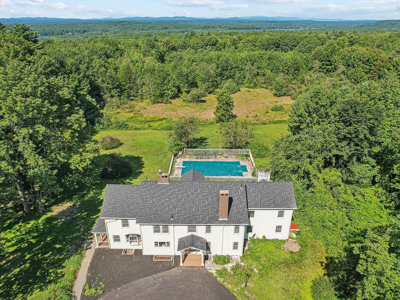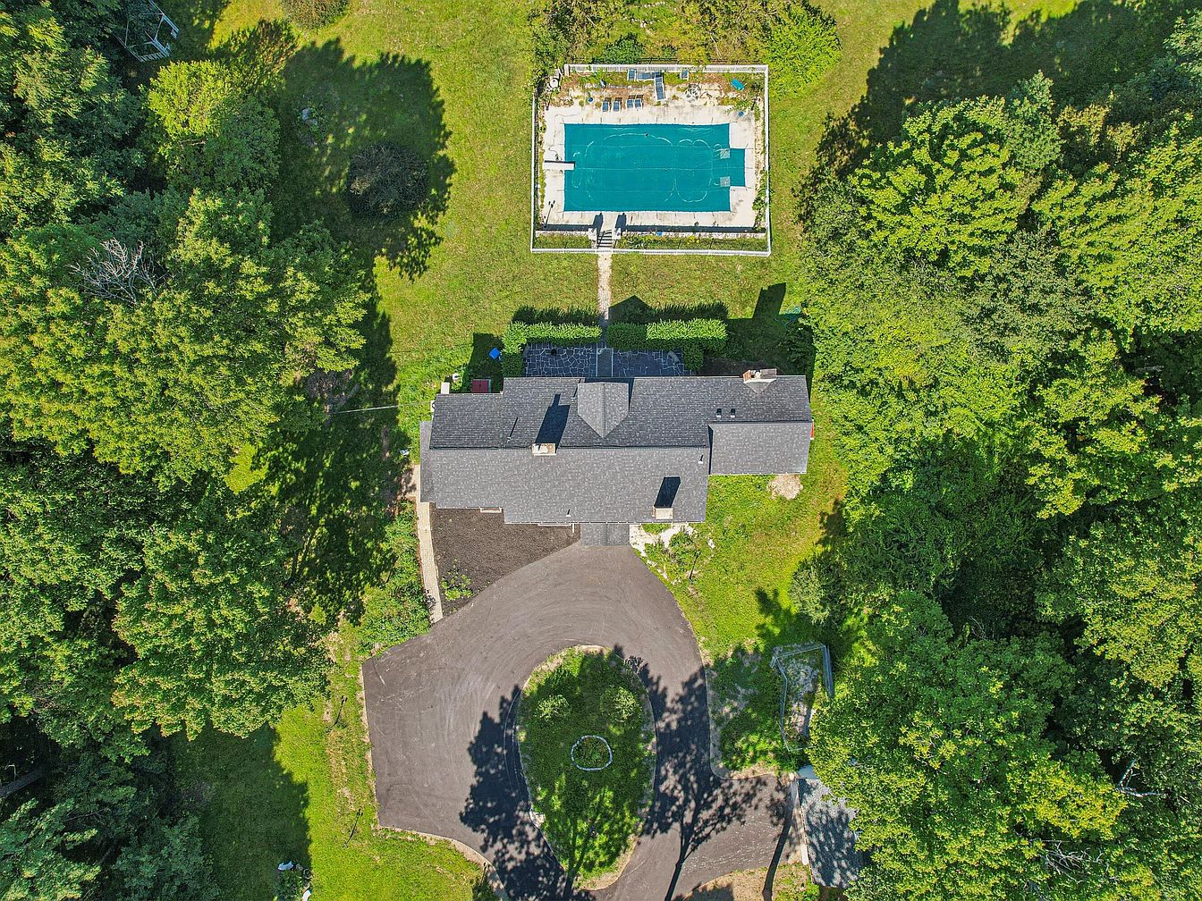 This aerial image captures a spacious property with a prominent, historic American home at its center. The house features a dark shingle roof and a sprawling layout surrounded by lush green trees, providing a serene backdrop. A circular driveway leads to the front, bordered by manicured grass and additional trees. A large, inviting swimming pool is positioned in the backyard, complete with a paved surround and outdoor seating, inviting relaxation. The pool area is set against vibrant greenery, enhancing the tranquil atmosphere. Overall, the visual harmony of architecture and nature creates a picturesque setting.