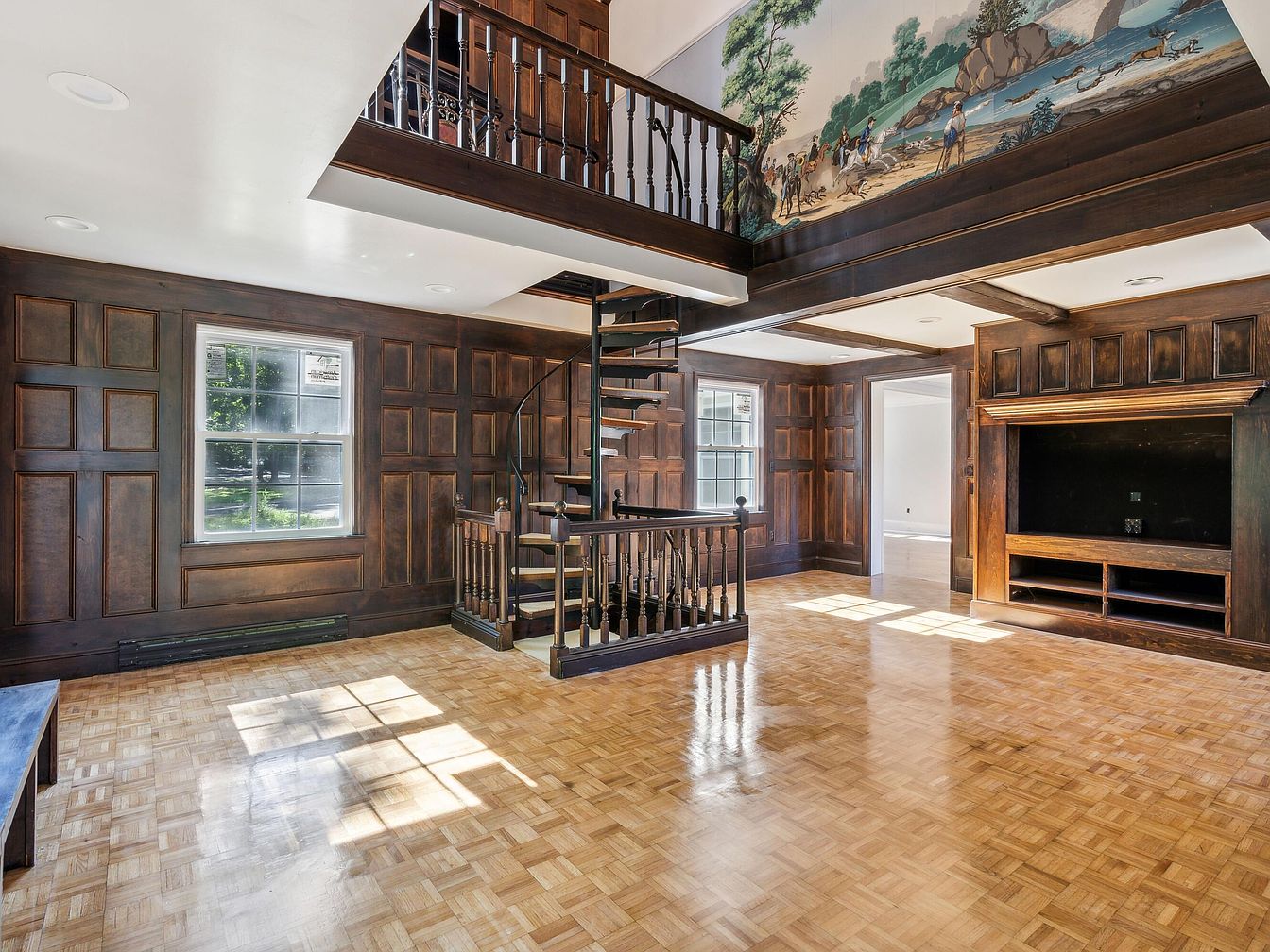 The space showcases rich dark wood paneling that extends up to the ceiling, lending a warm and inviting ambiance. A spiral staircase leads to an upper level, accentuated by ornate railings. The floor features a classic parquet pattern, reflecting a polished finish that complements the dark hues of the walls. Large windows allow natural light to flood in, casting soft shadows on the wooden surfaces. A focal point includes an elegantly designed built-in entertainment unit, providing a contrast against the intricate wood details. The overall aesthetic reflects timeless elegance, blending historic charm with modern functionality.