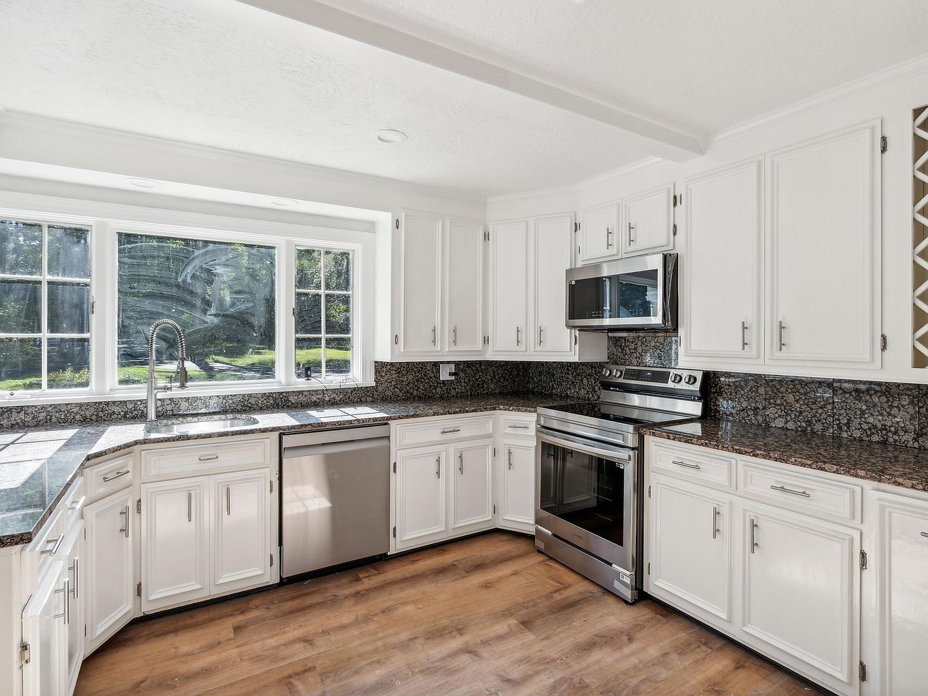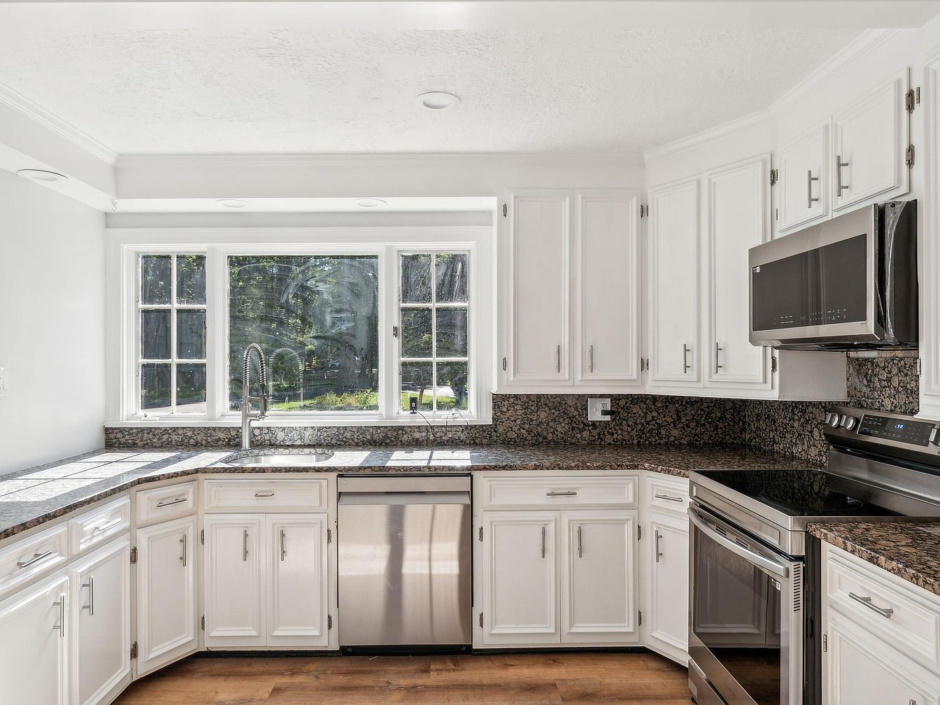 This kitchen features a modern design with a functional layout emphasizing efficiency. Crisp white cabinetry complements the dark granite countertops, highlighting the contrast. A corner sink positioned beneath expansive windows benefits from natural light, creating a bright and inviting atmosphere. Stainless steel appliances, including an oven and microwave, enhance the sleek aesthetic. The backsplash seamlessly integrates with the counters, while polished wooden flooring adds warmth to the space. Ample storage is provided by traditional cabinets, ensuring practicality. Overall, the room merges contemporary style with classic elements, making it a delightful cooking and gathering area.