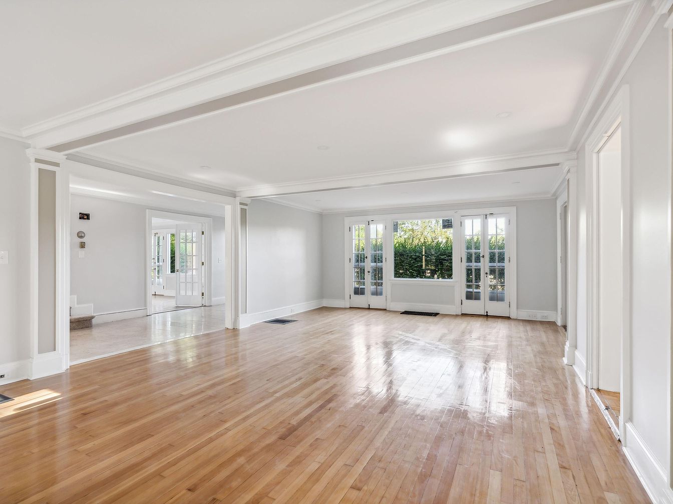 A spacious living room features polished hardwood flooring that reflects light, enhancing the airy atmosphere. The walls are painted a soft grey, providing a neutral backdrop for any decor. Crown molding adds an elegant touch along the ceilings, enriching the room’s architectural details. Large French doors invite natural light and offer a view of the outdoor greenery, while additional windows fill the space with brightness. Visible doorways lead to other rooms, creating an open layout. Minimalistic and uncluttered, the room presents a blank canvas for personal decoration, making it both inviting and versatile.
