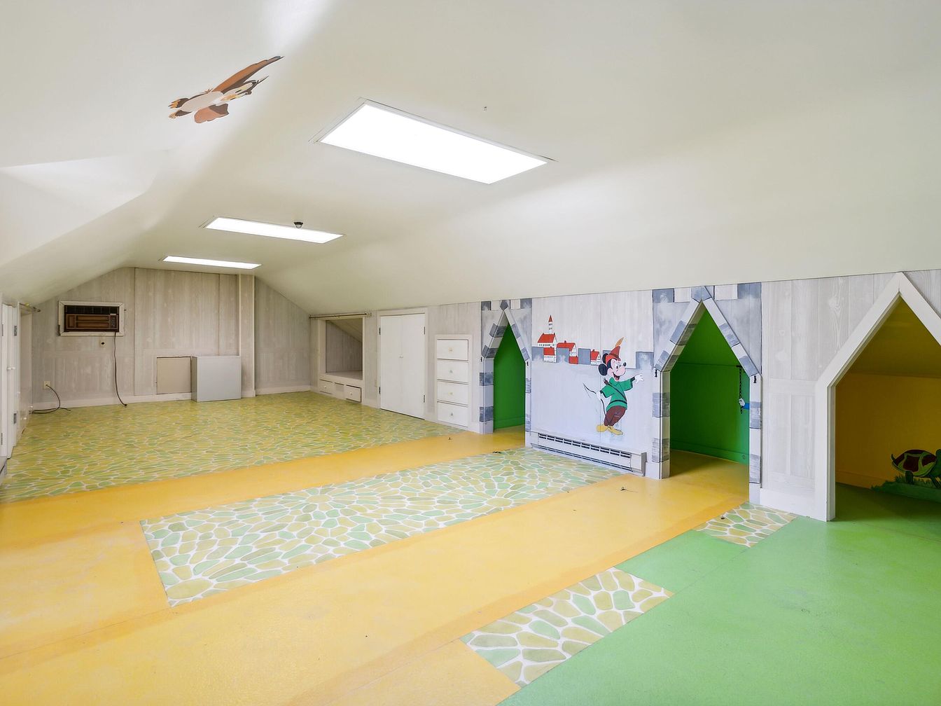 This expansive playroom features a whimsical design highlighted by a ceiling with an angled roof and ample overhead lighting from several skylights. The flooring alternates between vibrant yellow and pastel green, complemented by decorative patterns resembling stone pathways. Walls showcase playful murals, including one of a cartoon character next to colorful, archway-shaped play spaces, fostering a lively atmosphere. White cabinetry and built-in storage provide functionality, while a wall-mounted air conditioning unit enhances comfort. Soft, child-friendly colors create an inviting environment, making it ideal for imaginative play and creativity.