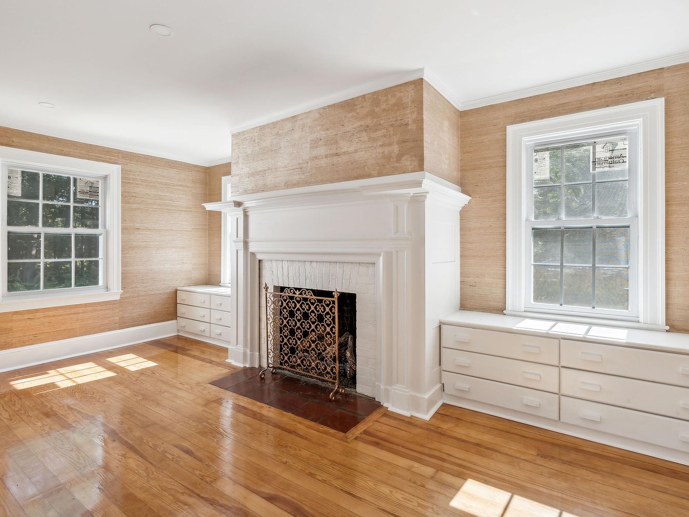 A cozy living room featuring rich hardwood flooring that reflects natural light. The walls are adorned with textured beige wallpaper, creating warmth. A large, elegant fireplace with a detailed white mantel serves as a focal point, framed by two classic white windows that allow sunlight to pour in. Flanking the fireplace, built-in cabinetry provides functional storage while maintaining a clean aesthetic. The simplicity of the furniture, characterized by crisp, white drawers beneath the windows, complements the room’s tranquil atmosphere. Overall, the combination of light, earthy tones and fine architectural details results in an inviting and sophisticated space.