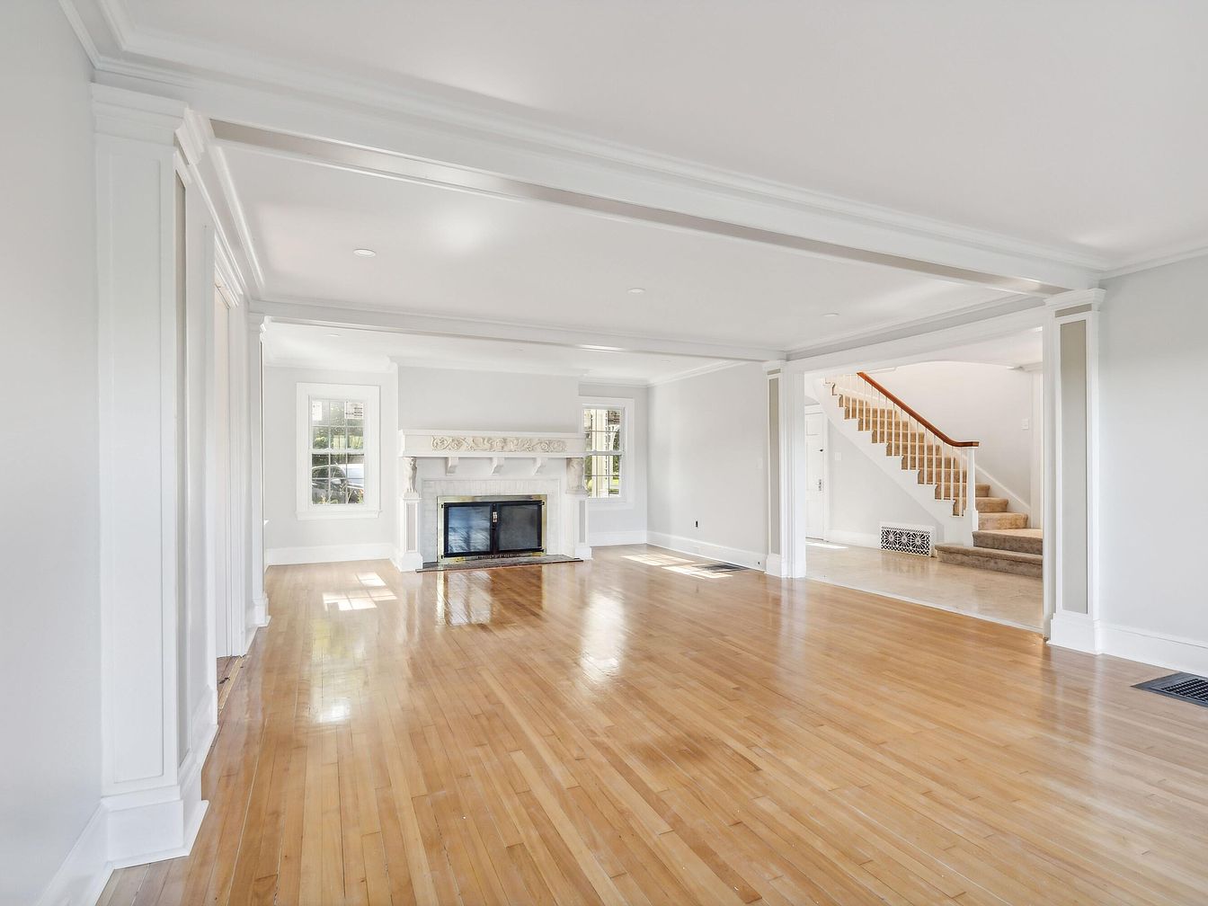 This spacious living room features a warm hardwood floor that enhances its inviting atmosphere. Bright, white walls paired with elegant crown molding create a classic aesthetic. A central fireplace acts as a focal point, adorned with delicate stone carvings, while its sleek black surround adds a modern touch. Large windows allow natural light to flood the space, accentuating the airy feel. The layout is open, connecting seamlessly to the staircase visible in the background, which boasts a sturdy wooden railing and soft carpeting. Simple yet elegant design elements contribute to a timeless and refined living area.