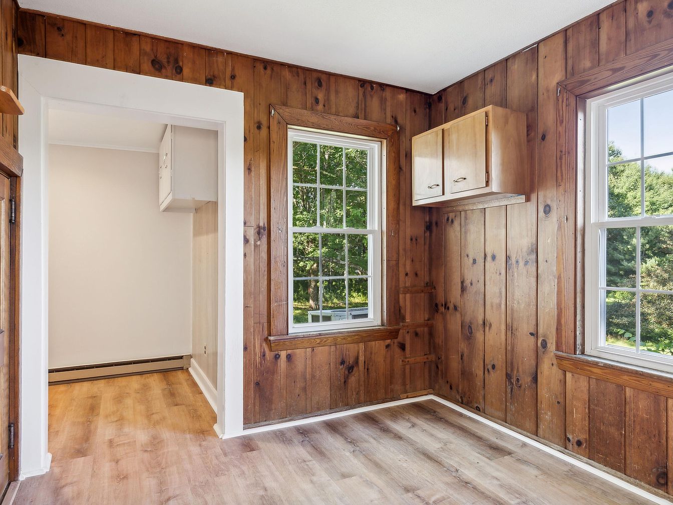 This corner of the house features warm wooden paneling that creates an inviting atmosphere. Two large windows allow natural light to permeate the space, showcasing views of greenery outside. The light wood flooring complements the deep tones of the walls, enhancing the coziness. A simple wooden shelf hangs above, offering practical storage. The clean white trim around the windows and doorway adds a touch of brightness, contrasting nicely with the darker wood. The adjacent room suggests a transition to a more modern area, with its lighter walls inviting curiosity about the overall flow of the home.