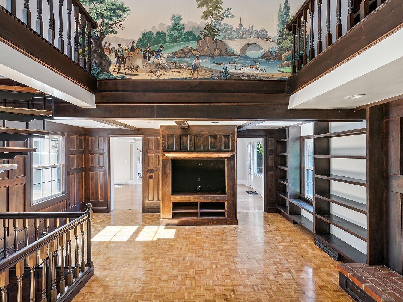 The living room features rich wooden paneling and intricate dark wood beams, creating a warm and inviting atmosphere. A large mural graces the wall, depicting a pastoral scene that complements the room’s historic charm. Sunlight streams through large windows, highlighting the parquet flooring’s golden tones. Open shelving is built into the walls, providing storage and display opportunities. A cozy seating area is centered around a traditional fireplace, adding to the room’s elegance. The staircase, with its ornate balustrade, leads to an upper level, enhancing the space’s verticality and inviting exploration within this beautifully crafted home.
