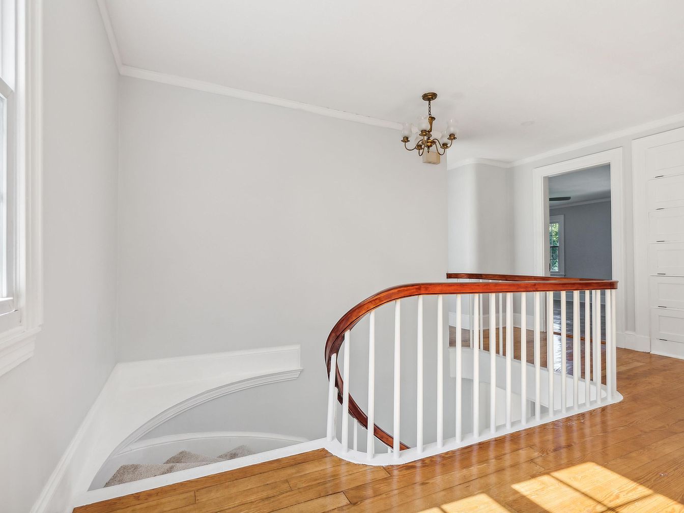 The image shows a staircase landing featuring elegant hardwood flooring that seamlessly extends into the space. A smooth, curved handrail made of rich wood contrasts beautifully with the white balusters and wall colors. The walls are painted in a soft gray, providing a calm backdrop. A vintage chandelier hangs from the ceiling, adding a touch of classic charm with its exposed bulbs. Natural light floods in through large windows, enhancing the airy feel. The landing flows into an adjoining room visible through a doorway, hinting at the home’s cozy layout and inviting atmosphere.