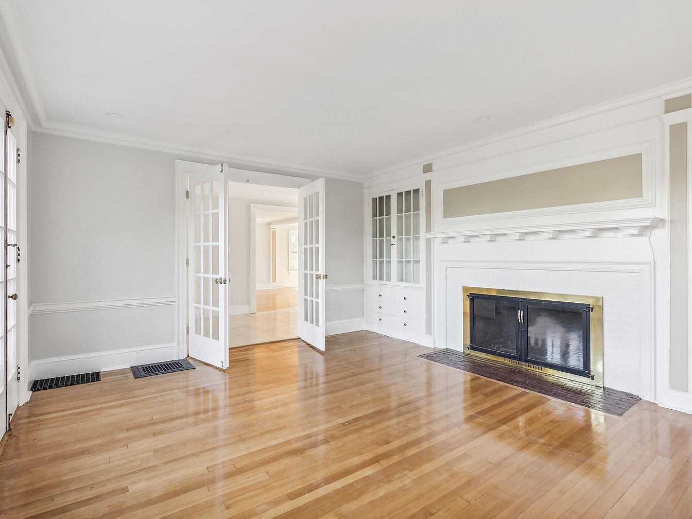 This living room features a spacious layout with gleaming hardwood floors that reflect light beautifully. The pale gray walls provide a soft backdrop, enhanced by white crown molding and wainscoting, adding depth and elegance. A classic fireplace with a black screen and brass accents serves as a focal point, framed by a minimalist mantel. Two sets of French doors open to adjoining spaces, allowing natural light to flood the area, complemented by strategically placed vents. Built-in shelves flank the fireplace, providing both functionality and aesthetic appeal, offering an inviting atmosphere ideal for gatherings.