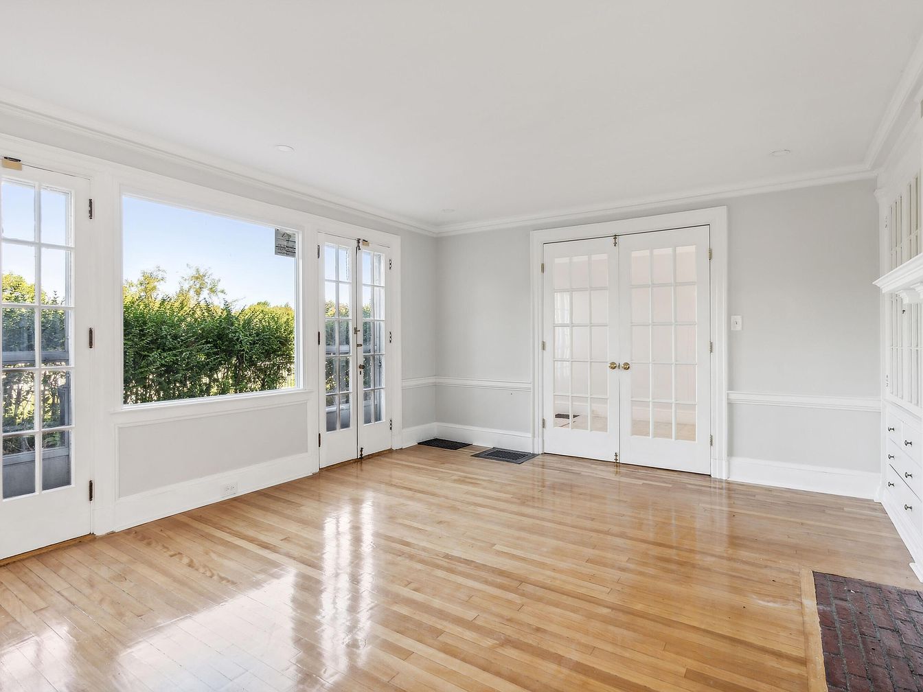 This sunroom features large French doors and windows that invite natural light while providing a view of lush greenery outside. The walls are painted a soft gray, enhancing the bright and airy atmosphere. The hardwood floor, polished to a shine, complements the classic white trim and molding around the windows. Built-in cabinetry adds functionality without compromising aesthetics, showcasing a design that balances modern comforts with traditional architecture. The room is spacious, allowing for various furniture arrangements. Overall, the tranquil setting encourages relaxation, making it an ideal space for reading or enjoying morning coffee.