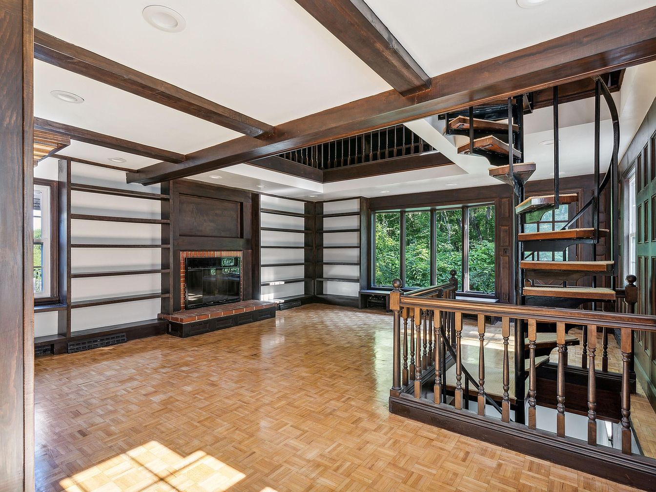 This spacious living room features rich dark wood beams adorning the ceiling, enhancing the room’s height. The floor is elegantly laid with light parquet, providing a warm contrast. A striking fireplace, bordered by a classic brick, serves as a central focal point, flanked by open shelving perfect for decorative items. Large windows allow ample natural light, framing verdant views of the surrounding landscape. A modern spiral staircase winds up to a loft area, adding an industrial touch. The blend of traditional and contemporary elements creates a harmonious aesthetic, ideal for both relaxation and entertaining.