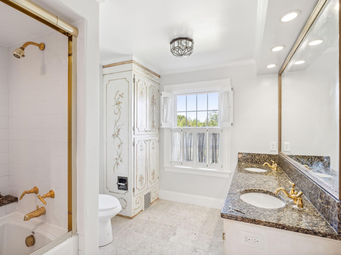 The bathroom features a harmonious blend of classic and contemporary elements. A luxurious granite countertop complements dual sinks with ornate gold faucets. A vintage-inspired cabinet, adorned with delicate floral designs, adds charm and provides ample storage. Adjacent, a glass shower enclosure showcases golden fixtures against pristine white tiles, creating a light, airy atmosphere. Soft, white walls further enhance the brightness of the space. Natural light floods in through a large window dressed with sheer curtains, offering views of lush greenery outside. Polished marble flooring adds elegance, completing the tranquil and sophisticated ambiance of this exquisite bathroom.
