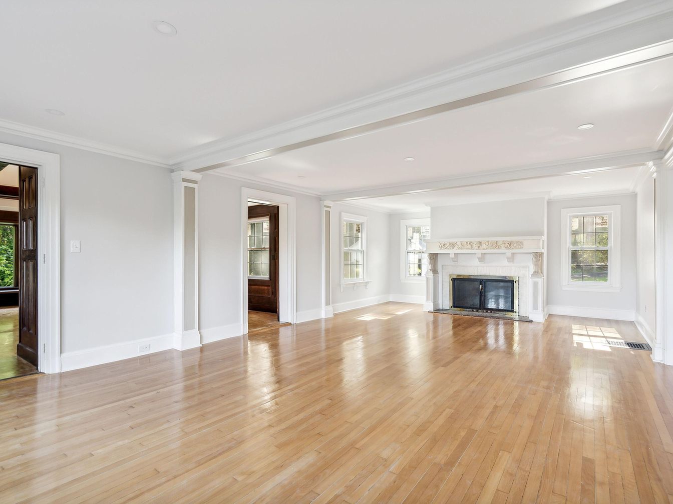 A spacious living room featuring polished hardwood floors that reflect natural light. The pale gray walls create a soft, inviting atmosphere, while intricate crown molding and detailed trim elevate the aesthetics. A striking white marble fireplace with elegant carvings serves as a focal point, complemented by black accents. Large windows allow ample sunlight, enhancing the warm ambiance. The open layout encourages flow between connected spaces, providing versatility for furniture arrangement. Architectural details like tall baseboards and coffered ceilings add sophistication, while the overall design embodies a blend of modern updates and classic elegance, ideal for both relaxation and entertainment.