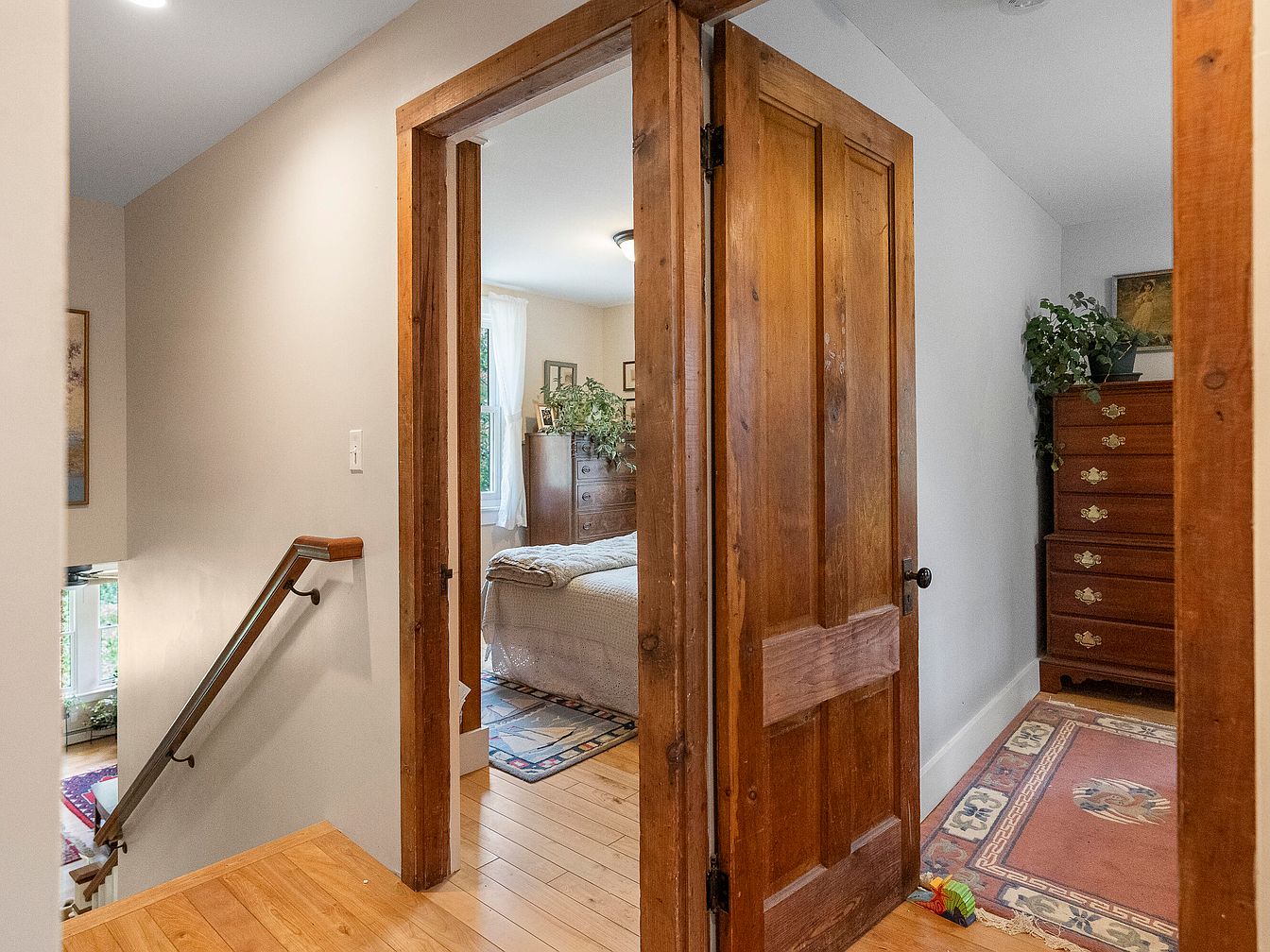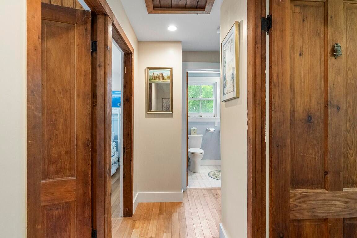 A cozy hallway lined with warm, honey-toned wooden doors leads directly to a small, bright bathroom at the far end. The hallway has light beige walls adorned with framed art, and soft recessed lighting from the ceiling. Natural wood trim and flooring add rustic charm, highlighting the historic character of the home. The bathroom visible ahead features a gray wall, white trim, and a classic window letting in daylight. Subtle decorative touches, like a round rug and coordinated accessories, provide a welcoming feel. Overall, the space merges traditional architecture with soft, neutral tones and homey accents.