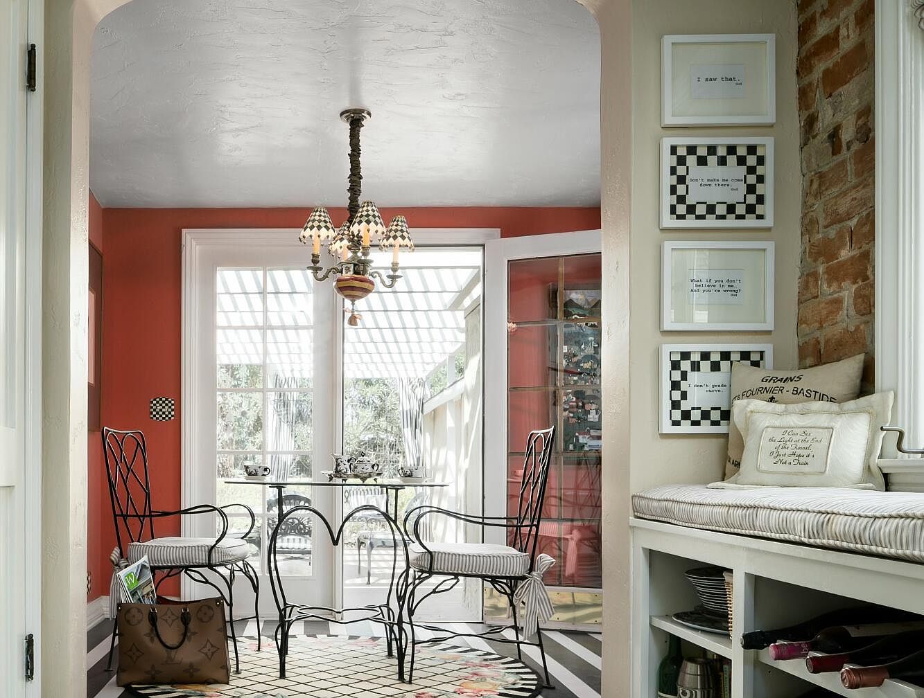 A cozy sunroom space with vintage charm, featuring a pair of delicate wrought iron chairs with striped cushions and a small glass-top table set for tea. The warm terracotta walls add vibrancy and are complemented by creamy archways and French doors, allowing abundant sunlight to pour in from a white pergola just outside. A whimsical chandelier with patterned shades hangs overhead. To the side, a cushioned window seat with striped pillows rests against an exposed brick wall, above which hang four framed prints, including checkerboard designs. Storage cubbies below the bench house wine bottles and plates, completing a relaxed, inviting nook.