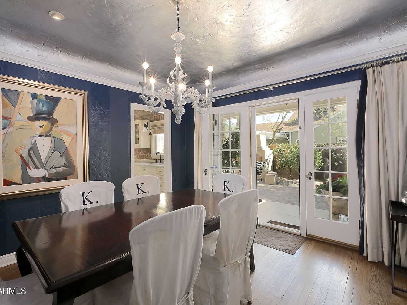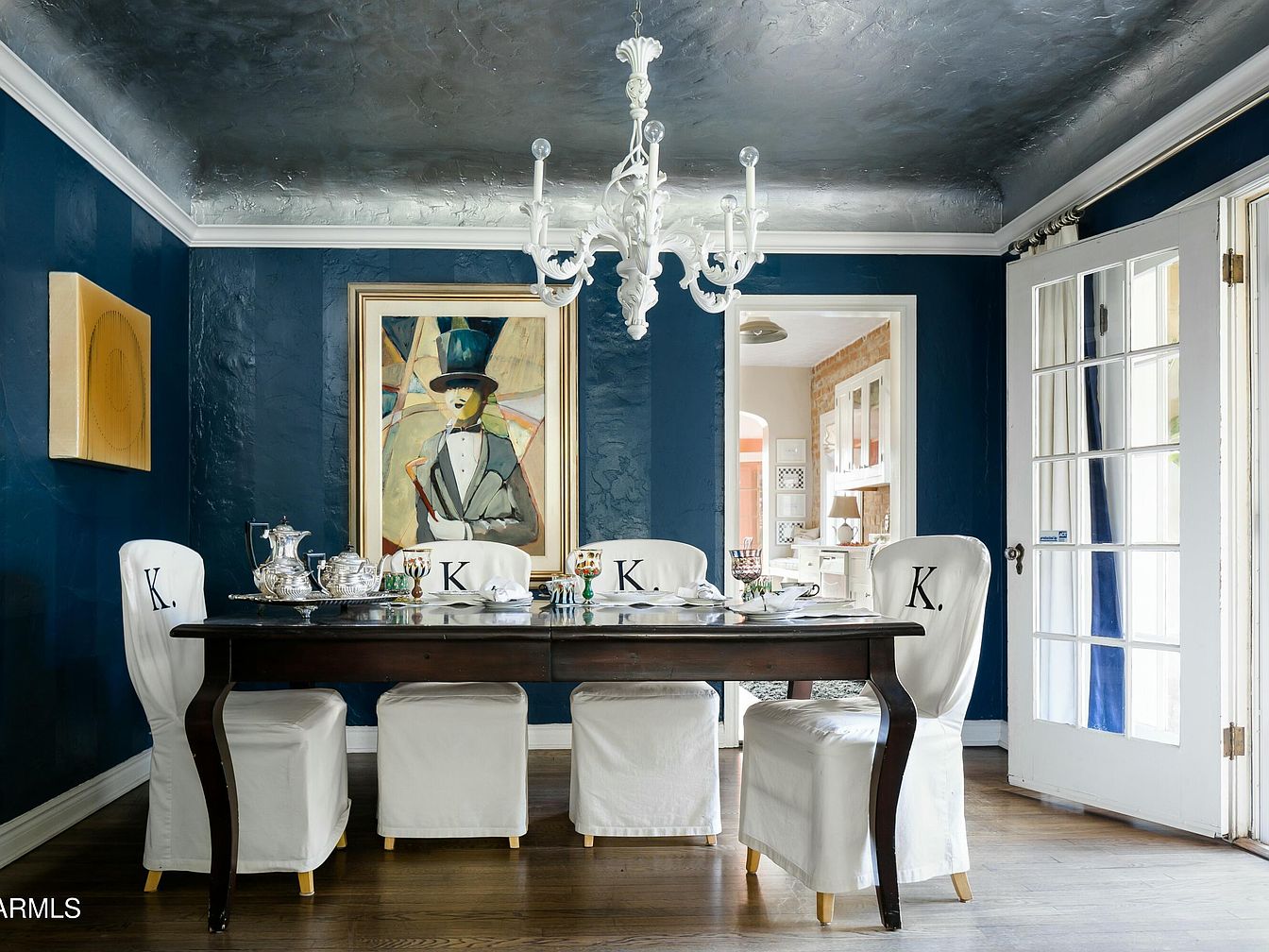 A formal dining room features striking deep blue textured walls and a gleaming silver-painted ceiling, creating an elegant and dramatic atmosphere. A large, dark wood rectangular table is paired with six white slipcovered chairs, each monogrammed with the letter ‘K.’ Overhead, a white ornate chandelier adds a touch of vintage glamour. French doors with tall side windows allow abundant natural light, opening out to a garden patio. Cream drapes frame the doors. A large, whimsical portrait of a man in a top hat adds artistic flair, and a doorway connects to an adjoining room with exposed brick accents.