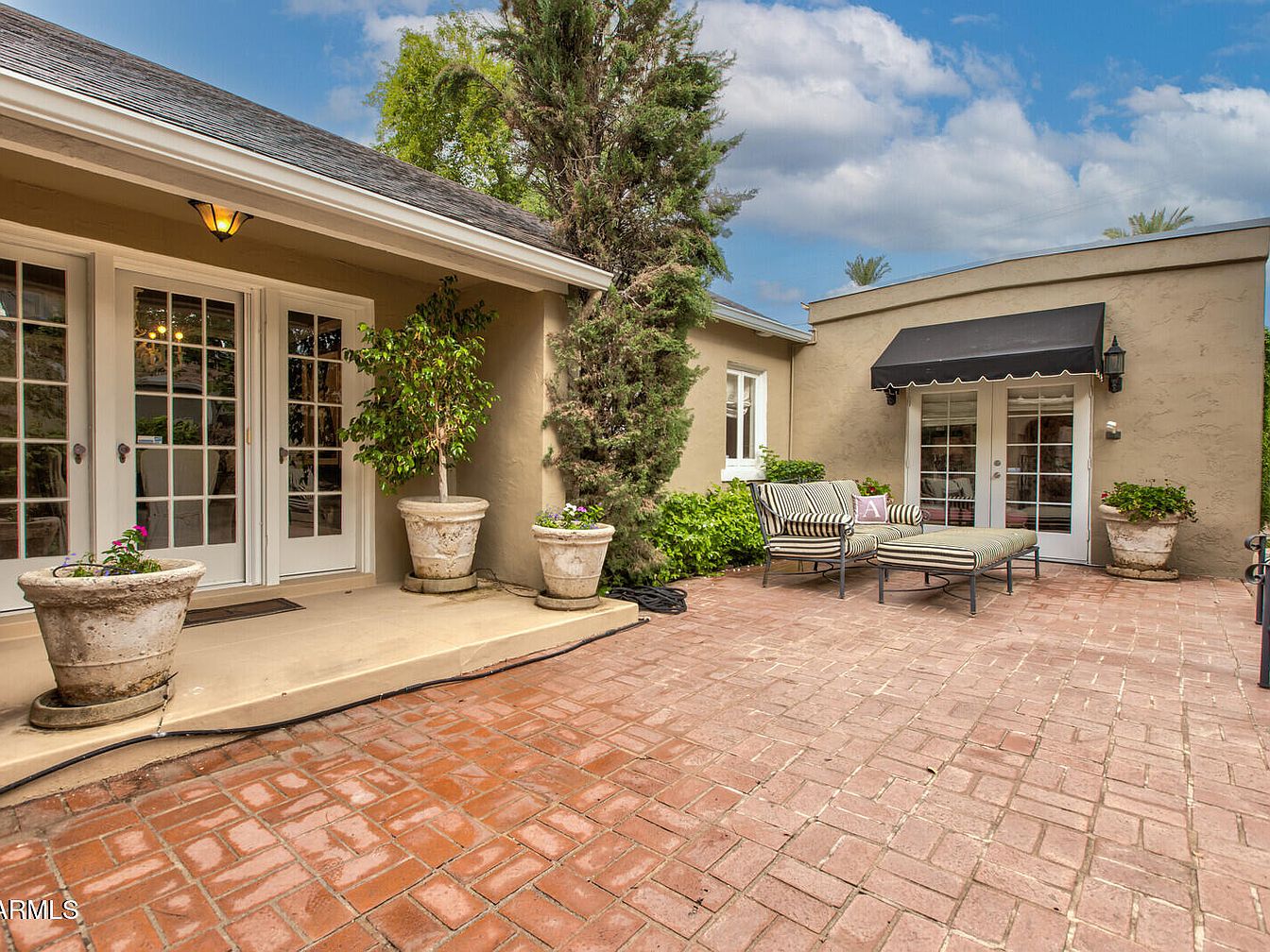 A spacious brick patio bordered by beige plaster walls features multiple French doors with white trim, allowing ample natural light into the house. Potted plants, including two large, weathered urns with lush greenery, flank a step leading to the central doors. A black awning with scalloped trim shades another set of French doors, adding a touch of elegance. Comfortable lounge seating with striped cushions and decorative pillows creates an inviting corner, perfect for relaxing outdoors. The patio is surrounded by well-maintained shrubs and a tall evergreen tree, combining natural elements with a classic, understated color palette.