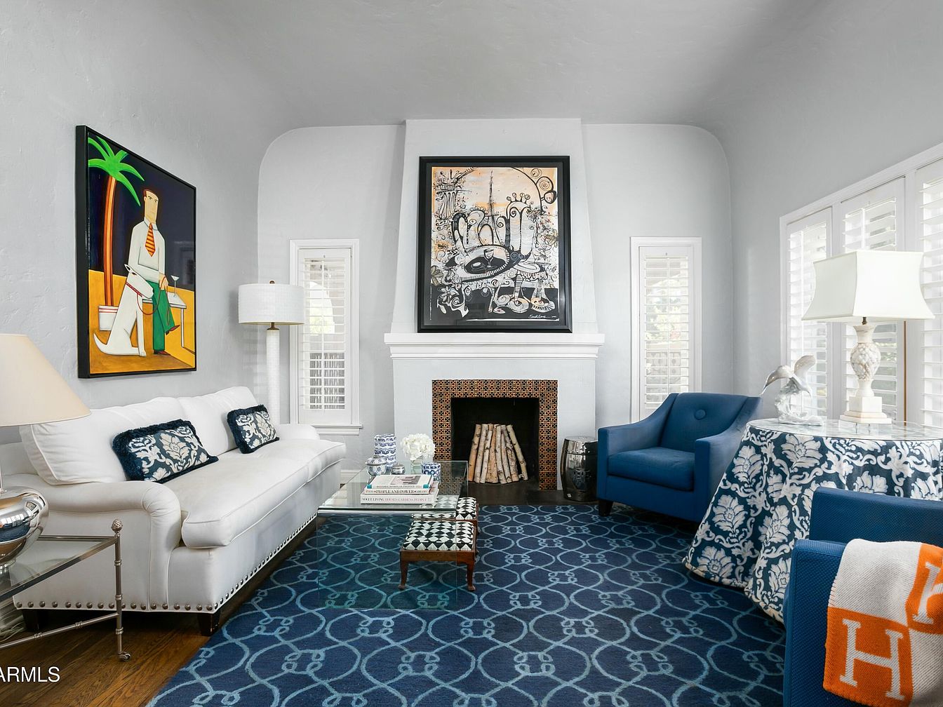 A bright and stylish living room features soft gray walls and a high, gently curved ceiling. The focal point is a white fireplace with a decorated tile surround, flanked by tall windows with white shutters that allow natural light to stream in. Furnishings include a white sofa with blue and white accent pillows, a glass coffee table, and two plush blue armchairs, one paired with a table draped in a floral blue fabric. Modern art, bold and colorful, hangs above the sofa and fireplace, adding visual interest. A geometric blue rug ties the space together, creating a balanced, sophisticated look.