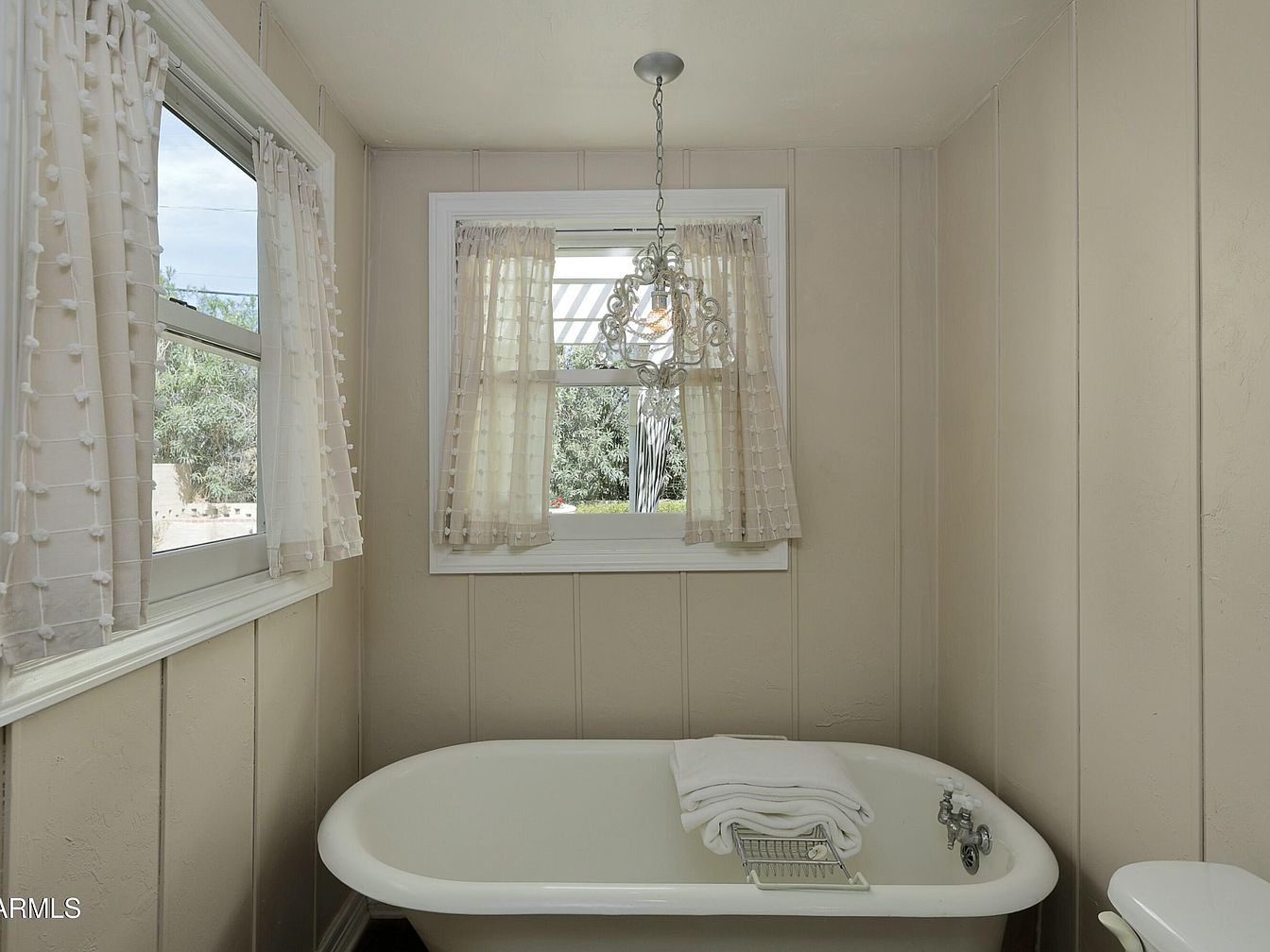 A quaint bathroom features a classic clawfoot bathtub positioned beneath a large window, inviting natural light to fill the space. The walls are painted a warm beige, and vertical wood paneling adds vintage charm. Both windows have sheer, cream-colored curtains with a delicate, tufted texture, softly filtering sunlight and offering a view of green foliage outside. A simple, ornate chandelier hangs above the tub, giving a touch of elegance. Softly folded towels rest atop the tub, and a bath tray sits ready, enhancing the room’s inviting and serene aesthetic. The overall feeling is cozy, bright, and nostalgic.