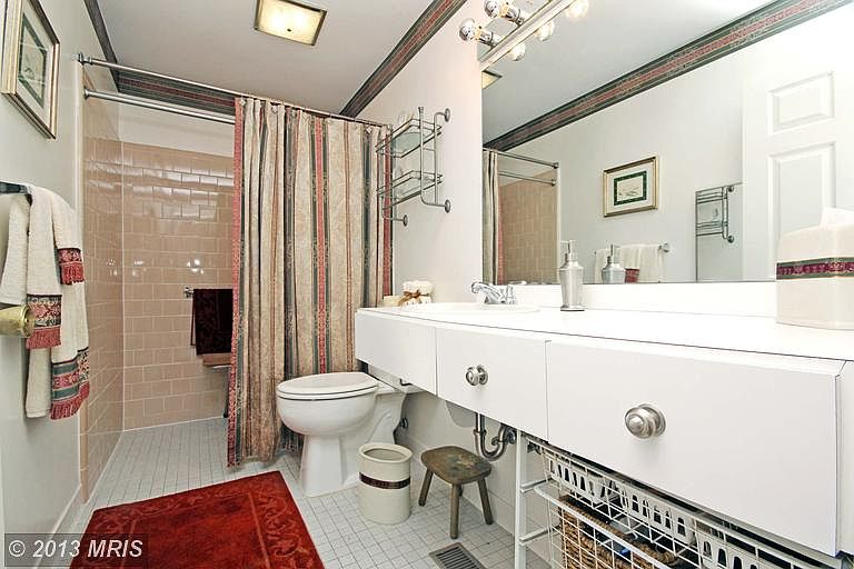 This bathroom features a clean, functional layout, showcasing a combination of vintage and practical elements. The color scheme includes pale pink tiles and a bright white vanity, creating a soft, welcoming atmosphere. A spacious countertop runs above the storage drawers, enhancing usability. A bright red bath mat adds a contrasting pop of color to the tiled floor. The shower area has a patterned curtain that introduces warm tones, while the walls are adorned with subtle decorative borders. Lighting is provided by a linear fixture above the mirror, illuminating the space effectively, while chrome fixtures add a touch of modern elegance.