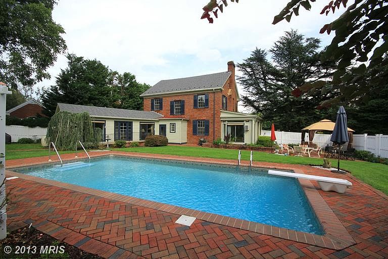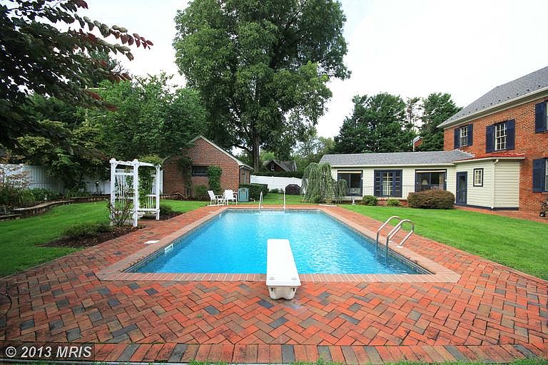 A serene backyard features a vibrant pool framed by a brick patio, accentuating a classic look. The turquoise water glistens under a partly cloudy sky, while lush greenery surrounds the area, offering a natural retreat. A diving board stands at the pool’s edge, inviting leisure and fun. Flanking the pool are neatly arranged loungers, ideal for relaxation. The adjacent house showcases a traditional architectural style with red brick and blue shutters, harmonizing with the outdoor space. A white trellis on the left adds a touch of elegance, enhancing the overall inviting and refreshing ambiance.