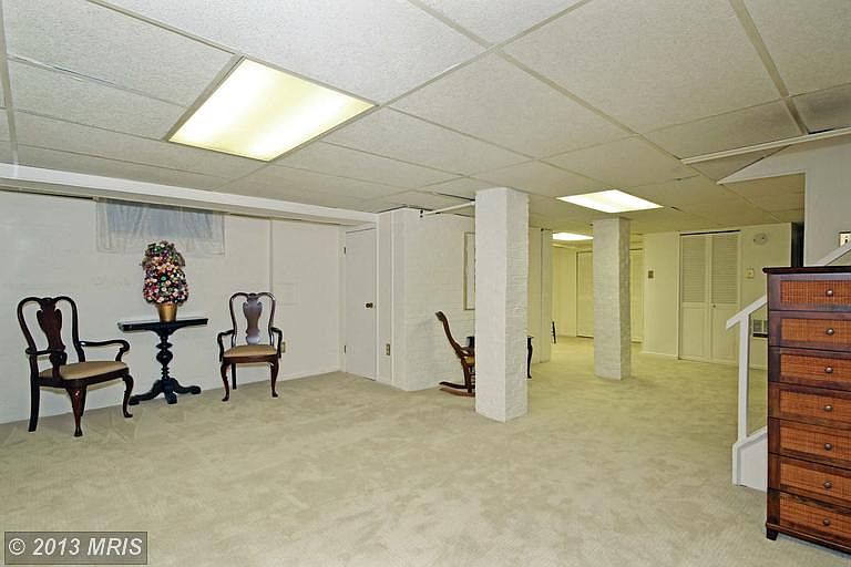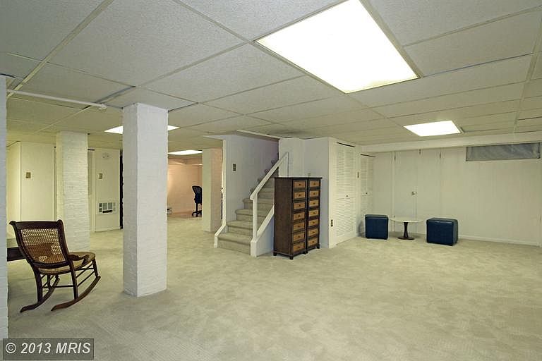 This spacious basement features a neutral palette, dominated by light beige carpeting and off-white painted walls, creating an inviting atmosphere. Two elegant wooden chairs flank a small black table, adorned with a colorful floral arrangement, adding a touch of warmth. The ceiling is gridded, with fluorescent lighting providing ample illumination. On one side, textured columns divide the open area, contributing to the architectural interest. The room leads to a set of stairs, hinting at additional spaces beyond. Minimalist decor ensures flexibility for various uses, while maintaining a clean, simple aesthetic.