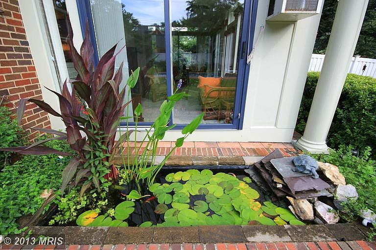 A tranquil garden area features a serene pond surrounded by rich greenery. Tall, dark-leaved plants and vibrant lily pads float gracefully on the water’s surface. The pond is bordered by rustic stonework and a few scattered rocks that complement the natural environment. A brick pathway leads to a large glass window, offering a glimpse into a stylish indoor seating area adorned with simple, warm-colored furniture. The color scheme merges earthy tones with fresh greens, creating a harmonious blend that promotes relaxation. Bright light filters through, enhancing the peaceful ambiance of this hidden outdoor retreat.
