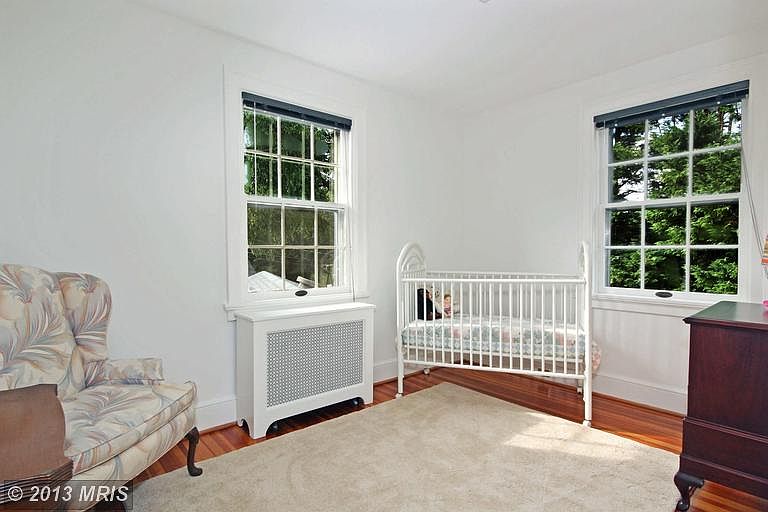 The nursery features a light, airy layout with soft white walls that create a serene atmosphere. Two large windows flanking the room allow natural light to flood in, highlighting the warm wooden flooring. A vintage white crib sits to one side, dressed in pastel linens, offering a charming focal point. Adjacent, a cozy armchair in floral upholstery invites relaxation, while a simple dark wooden dresser adds functionality. The gentle color palette promotes tranquility, making this space ideal for a young child. Architectural details such as the classic casing around the windows and baseboards add character to the room.
