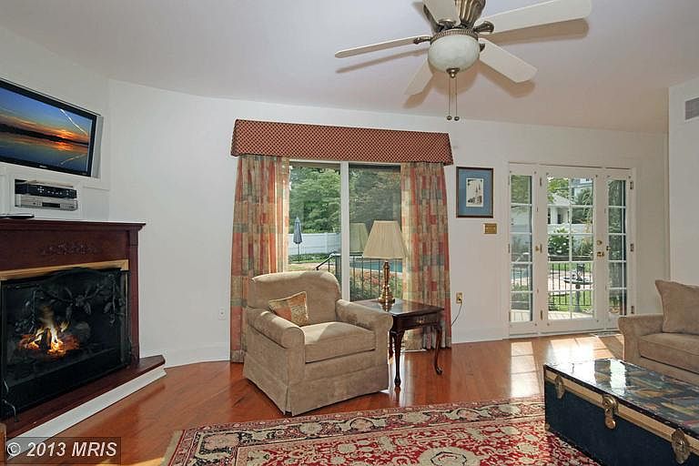 This cozy living room features a harmonious blend of classic and modern elements. A warm wood floor provides a rich foundation, complemented by a large area rug with intricate patterns. A plush armchair invites relaxation, while a stylish wooden coffee table adds functionality. The focal point is a decorative fireplace, lined with a dark wood mantel, which contrasts beautifully with the light walls. Natural light floods the space through large glass doors, framed by patterned drapes in soft hues. A ceiling fan and mounted TV add contemporary touches, creating a comfortable and inviting atmosphere.