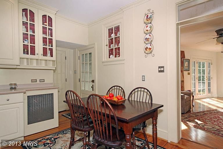A cozy dining nook featuring a classic wooden table surrounded by elegantly designed, dark wood chairs. The table showcases a bowl of vibrant red apples, adding a pop of color to the muted tones of the room. Surrounding cabinetry with glass-front doors displays decorative dishware, complementing the pale cream walls. The hardwood floor adds warmth, contrasted by an ornate area rug that enhances the inviting atmosphere. Architectural details include wainscoting along the walls and a gracefully arched doorway leading to another room, emphasizing the home’s historic character while providing an airy, open feel.