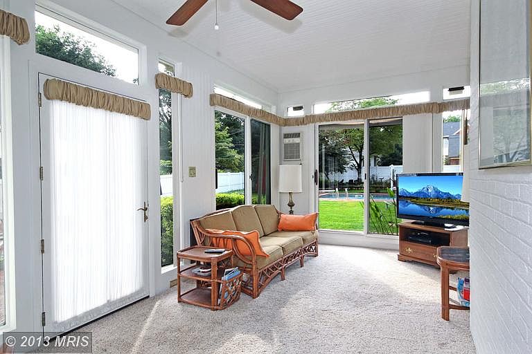 The sunroom features large windows that allow ample natural light, enhancing the airy and open atmosphere. A comfortable rattan sofa with soft cushions, including an accent pillow, invites relaxation. Adjacent, a small wooden table complements the seating arrangement. The ceiling fan contributes to airflow, while beige carpeting adds warmth underfoot. Neutral wall colors and a light wooden ceiling create a soothing palette. A TV stands on a modest wooden stand, offering entertainment along with a view of the lush garden outside. This space beautifully blends indoor comfort with a picturesque outdoor ambiance.