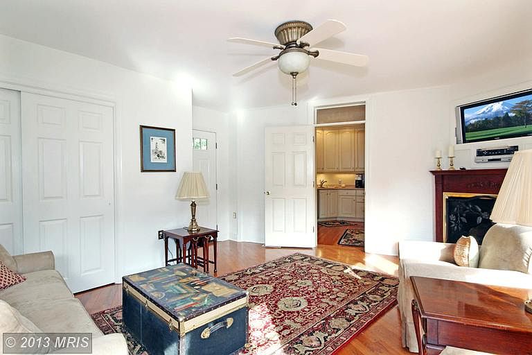 This cozy living room features a light color palette with white walls and warm wood flooring. A comfortable beige sofa complements the vintage-style Persian rug, which adds a touch of rich color and texture to the space. A wooden coffee table, paired with a decorative trunk, serves as a practical centerpiece. Architectural elements include a ceiling fan and a fireplace with an elegant mantel, enhancing the room’s charm. Natural light floods in from nearby doors, highlighting framed artwork on the walls. A TV mounted above the fireplace provides modern entertainment, balancing traditional and contemporary design.