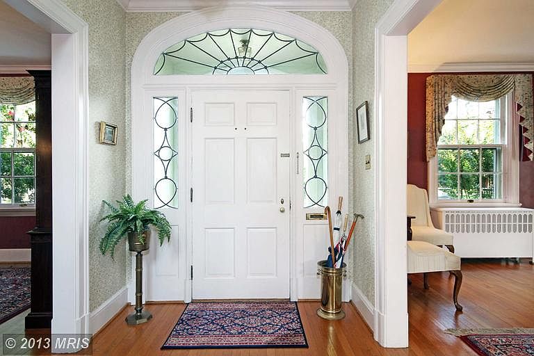 The entryway features a grand white front door flanked by ornate glass sidelights, enhancing natural light. A delicate arch above the door, adorned with geometric stained glass, adds elegance. The walls are painted a soft green with a subtle floral pattern, creating a welcoming atmosphere. A patterned area rug lies on polished hardwood floors, contributing warmth and color. To the left, a potted plant stands in a metallic planter, while an umbrella stand holds various umbrellas, showcasing functionality. An antique mirror and artwork embellish the walls, emphasizing historic charm. To the right, a glimpse of a cozy sitting area can be seen.