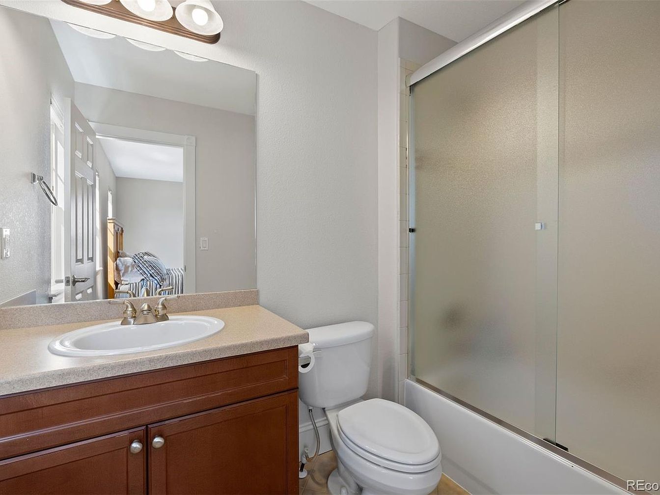 Compact bathroom featuring a single sink vanity with medium brown wooden cabinetry and a beige countertop. A rectangular mirror spans over the vanity, reflecting natural light from an adjacent bedroom visible through an open doorway. To the right, a white toilet sits next to a combination bathtub and shower with frosted sliding glass doors. Walls are painted a soft off-white color, contributing to the clean, neutral aesthetic. Overhead, a three-light fixture provides illumination above the mirror. The overall layout is functional and uncluttered, with simple finishes that maintain a bright and understated atmosphere.