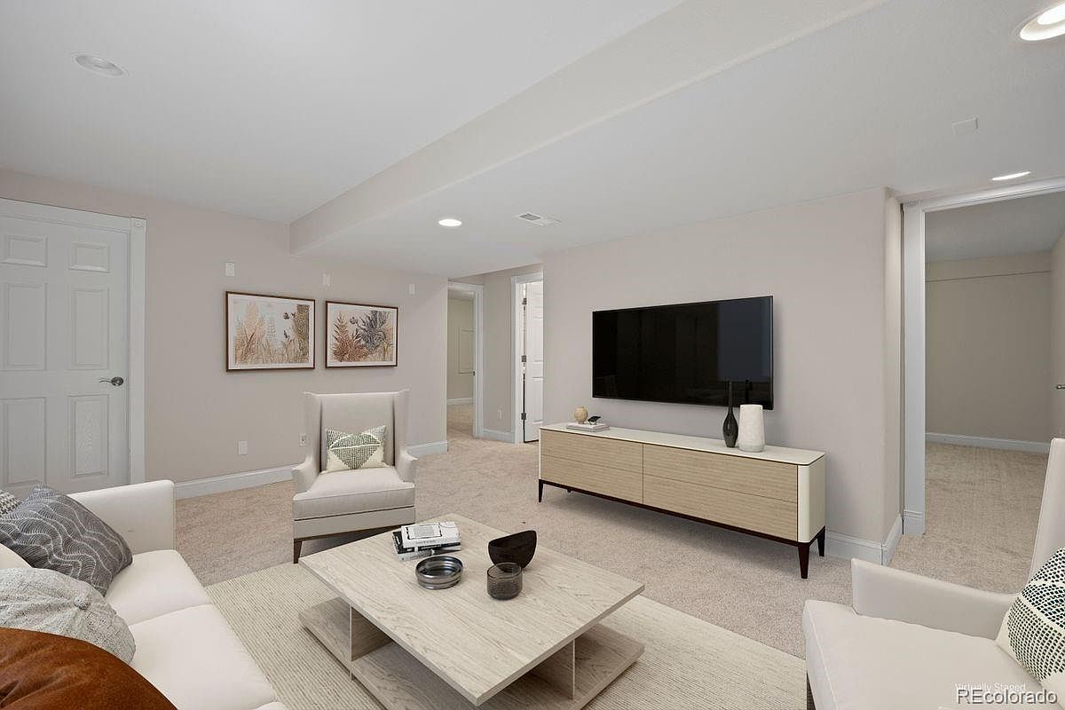 A cozy basement lounge with soft neutral carpeting and pale beige walls, featuring recessed ceiling lights for even illumination. The seating area includes a modern cream sofa, an armchair, and a light wood coffee table placed over a textured area rug. Opposite the seating is a minimalist light wood media console with simple decorative vases, topped by a large flat-screen TV mounted on the wall. Two framed botanical prints provide gentle artwork above the armchair. The space feels open and inviting, with multiple doorways leading to other rooms, and understated decor that creates a calm, contemporary atmosphere.