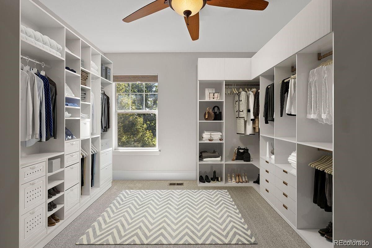 A spacious walk-in closet featuring built-in white cabinetry and open shelving that line three sides of the room. Shelves and hanging sections display neatly arranged clothes, shoes, and accessories. A large window allows natural light to illuminate the soft gray carpeted floor. A modern ceiling fan with wooden blades hangs in the center, providing a warm accent to the cool-toned space. The overall palette is neutral, with light walls and cabinetry contrasted by darker clothing pieces and shelving. A chevron-patterned area rug adds subtle visual interest, enhancing the organized and contemporary atmosphere.