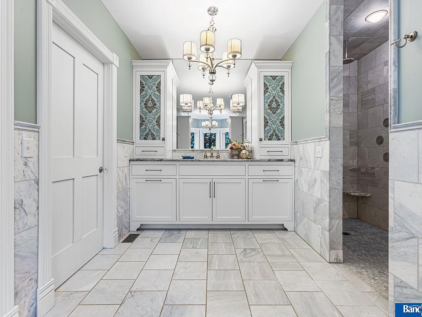 A sleek and modern bathroom showcases elegant design with an emphasis on functionality. The space features a light gray and white color scheme, enhanced by polished marble flooring and textured wall panels. The double vanity, adorned with a subtle countertop, includes stylish cabinetry with blue-patterned glass inserts, adding a pop of color. Flanking the vanity are chic, pendant light fixtures, providing warm ambient lighting. On the right, a spacious shower area features seamless marble tiles. The refined architectural details like crown molding complement the overall sophistication, making this relaxing retreat inviting and luxurious.